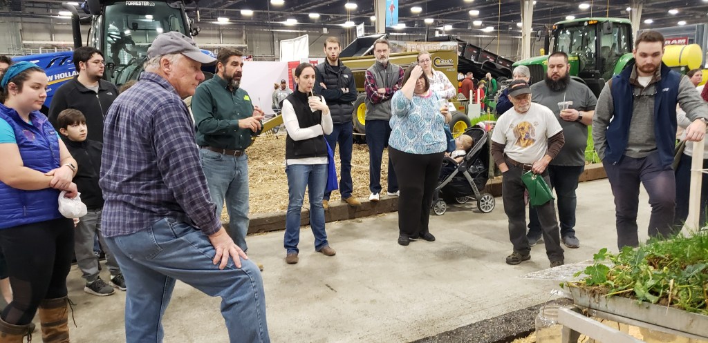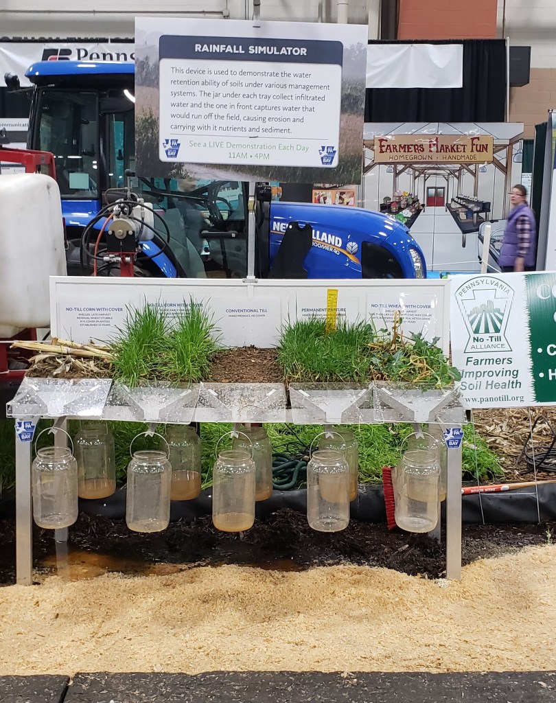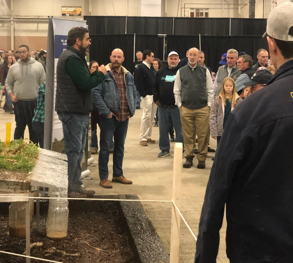 Board member Jeff Frey demonstrates water runoff at the simulator.This rainfall simulator created tremendous interest at the PA Farm Show.