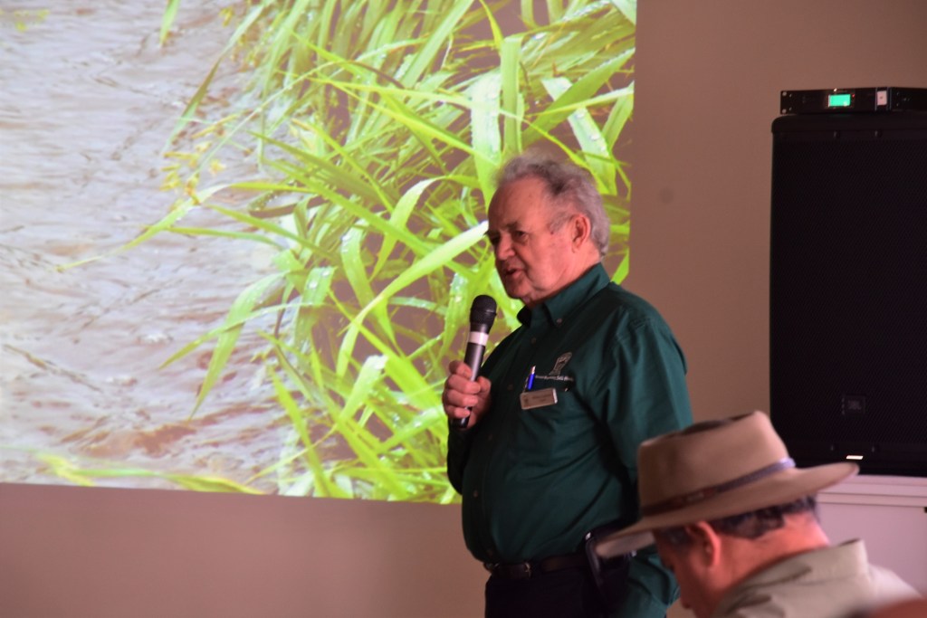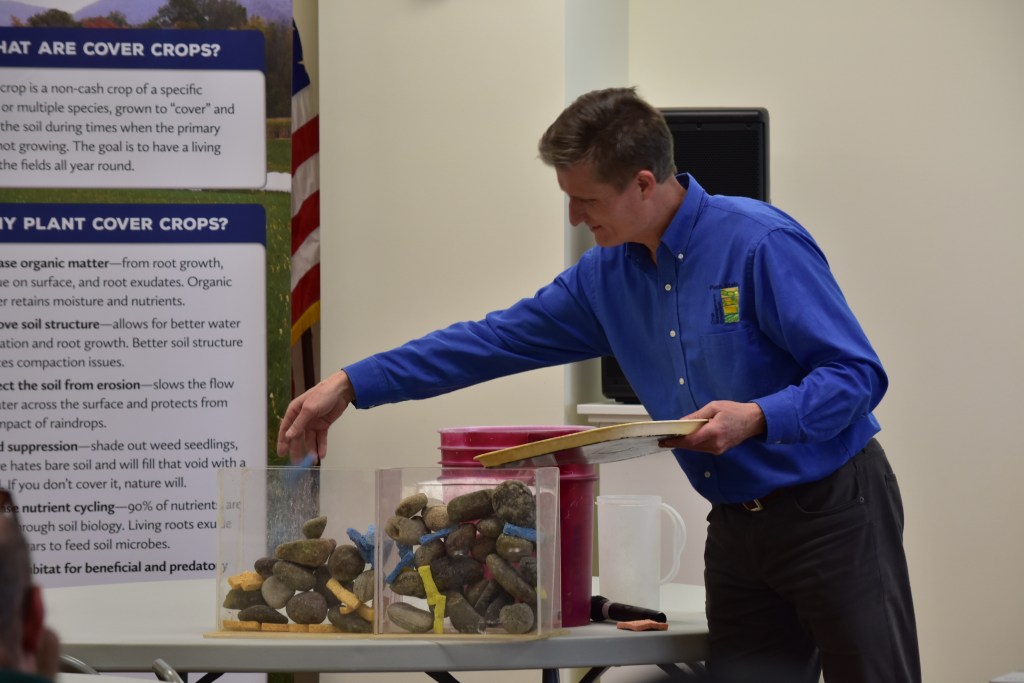 Ryan Graham discusses his no-till practices during the farmer panel discussion of why they are committed to no-till and cover crops.Bill Canon shows a picture of clear water leaving his field after an extreme rain event to demonstrate the value of cover crops in limiting soil loss.Sjoerd Duiker uses rocks and sponge sections to visually demonstrate how increased organic matter benefits soil.